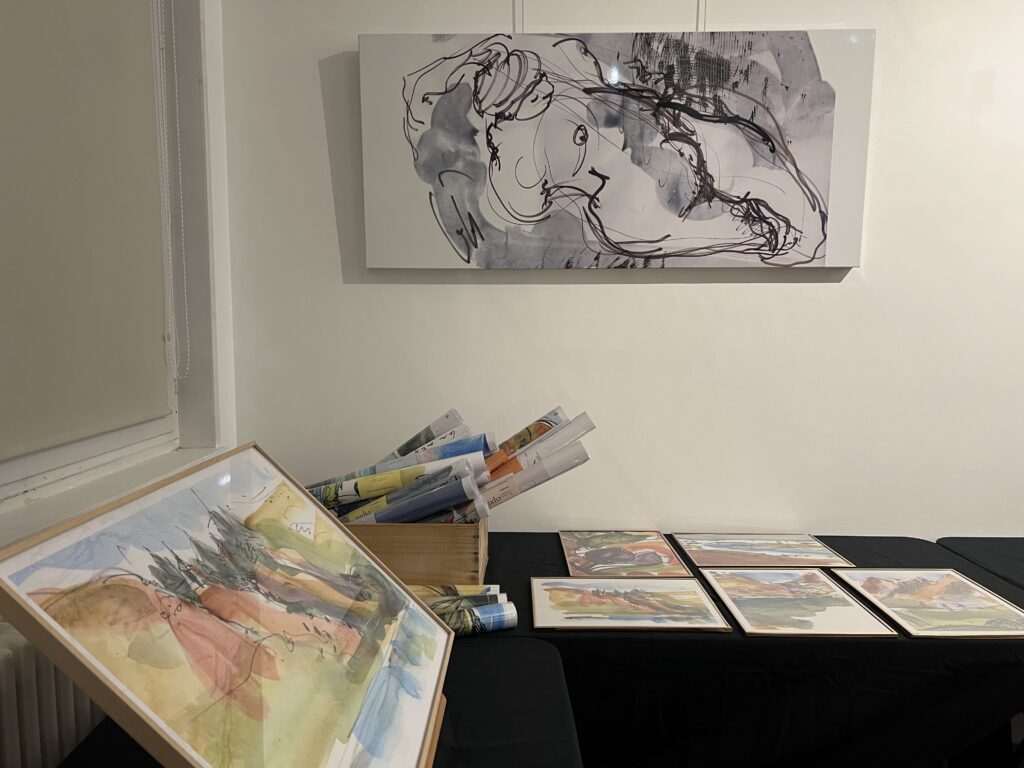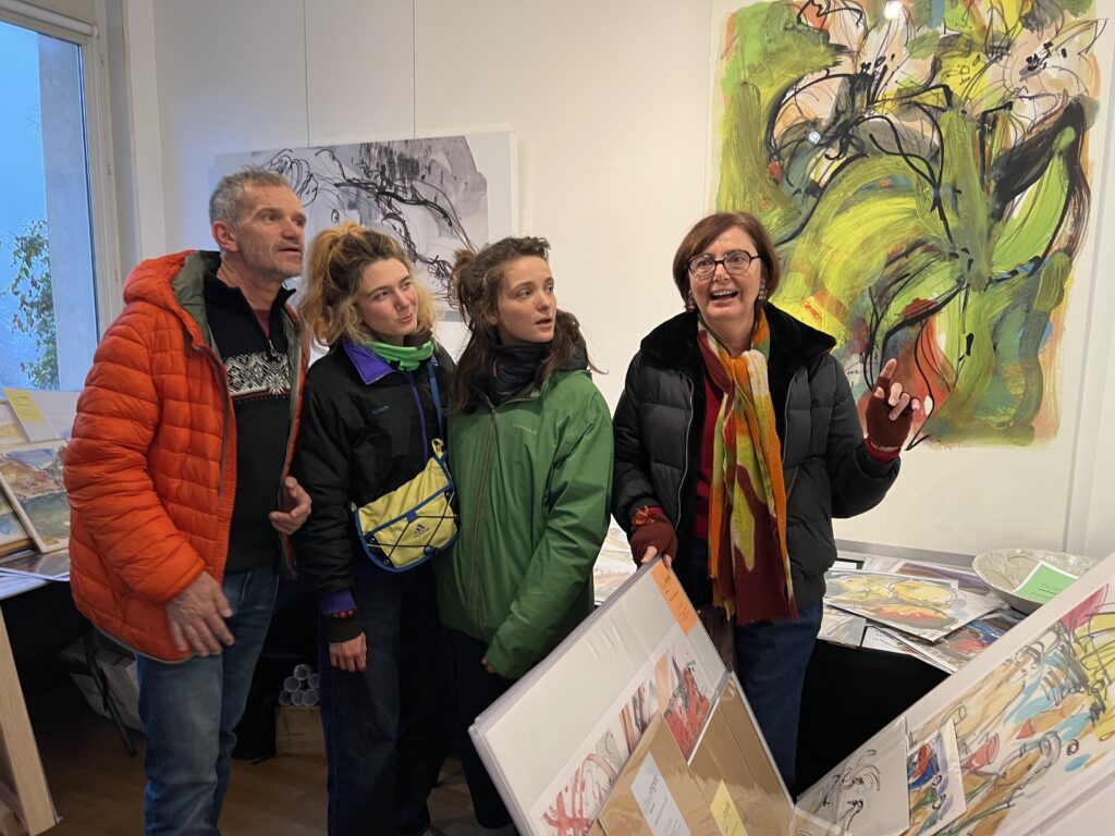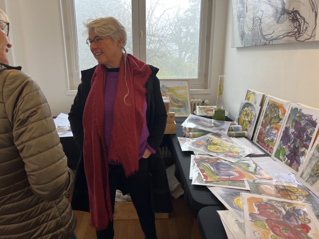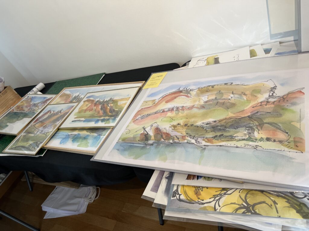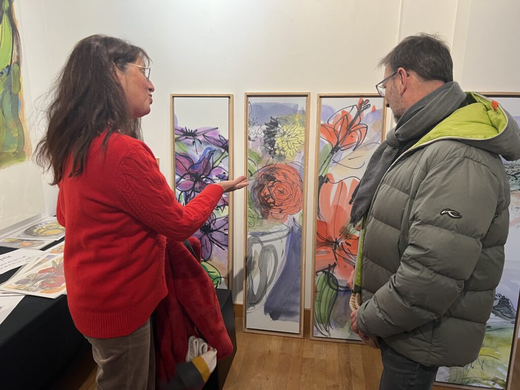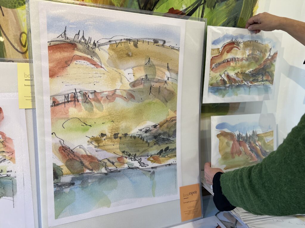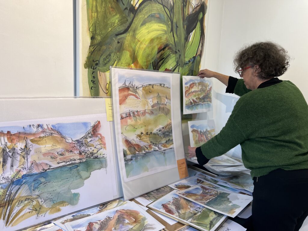 Pour la boutique 2025, j’ai projeté de réaliser de nouveaux grands formats panoramiques sur de la tôle d’aluminium, bandeaux horizontaux ou kakémonos. Les plus grands seront faits comme d’habitude sur commande et sur mesure, à partir de cette ensemble existant de variantes. Tourner autour de la pointe d’un compas ! Toutes les variantes me permettent d’approfondir à partir d’une sélection de l’année, et d’échapper à la routine. Je me suis permise de photographier la visiteuse ci-dessous, en train de choisir une présentation multi-format sur papier, sorte de panoramique en 3 morceaux mélangeant petits et grands posters. Dans ce cas précis, l’utilisation d’une cimaise à tableaux sans trou avec des câbles tendus lui permettra de changer ou switcher les images à loisirs. Les encadrements nécessaires pour du 30 x 40 cm et 50 x 70 cm sont standard. Elle trouvera pléthore d’encadrements à son goût dans les commerces de décoration et de beaux-arts. Je remercie au passage le Service Culturel de la Ville pour le grand et large plan de travail horizontal mis à disposition pendant l’exposition, sans lequel nous n’aurions pas pu manipuler, trier, fouiller, chiner dans tous ces dessins !