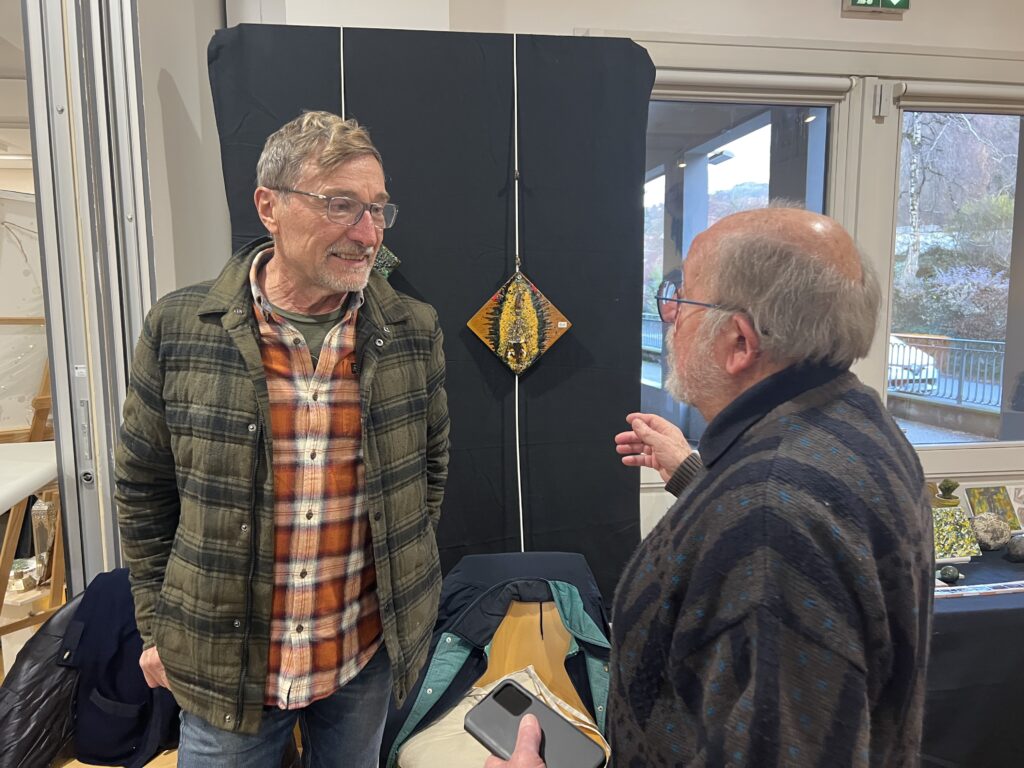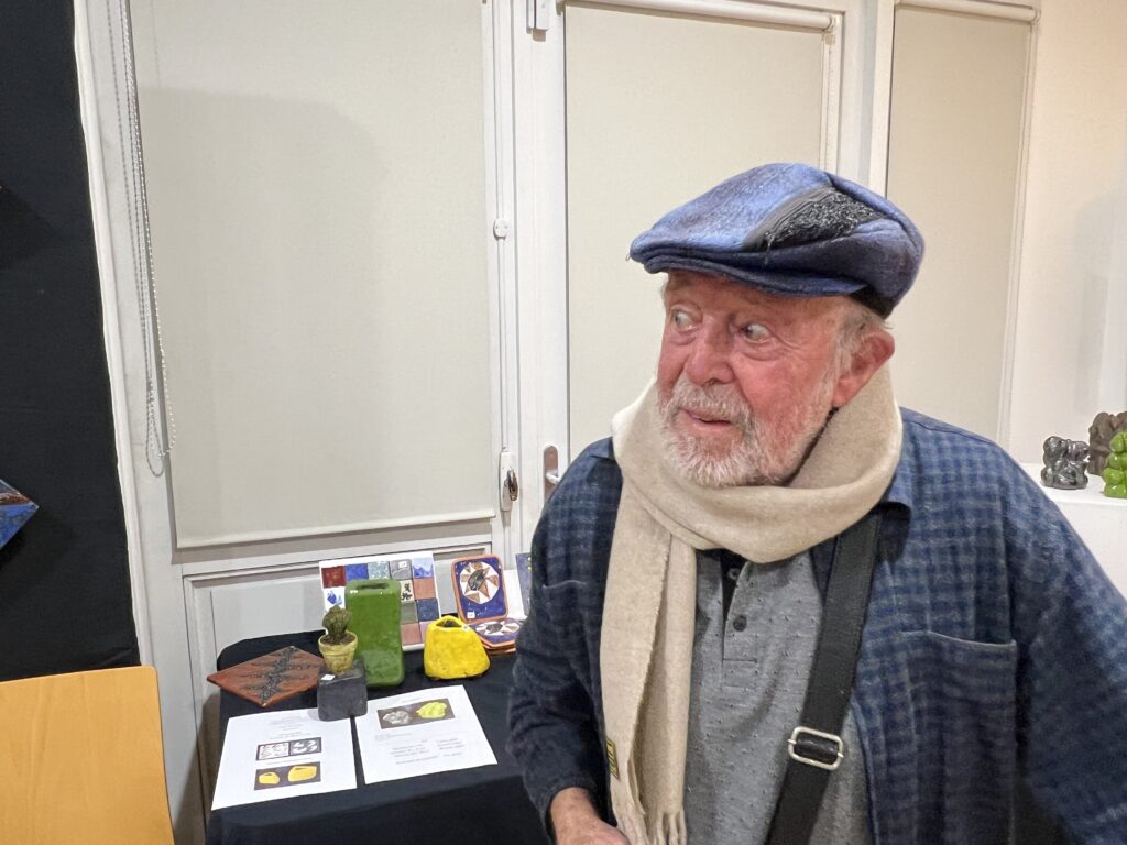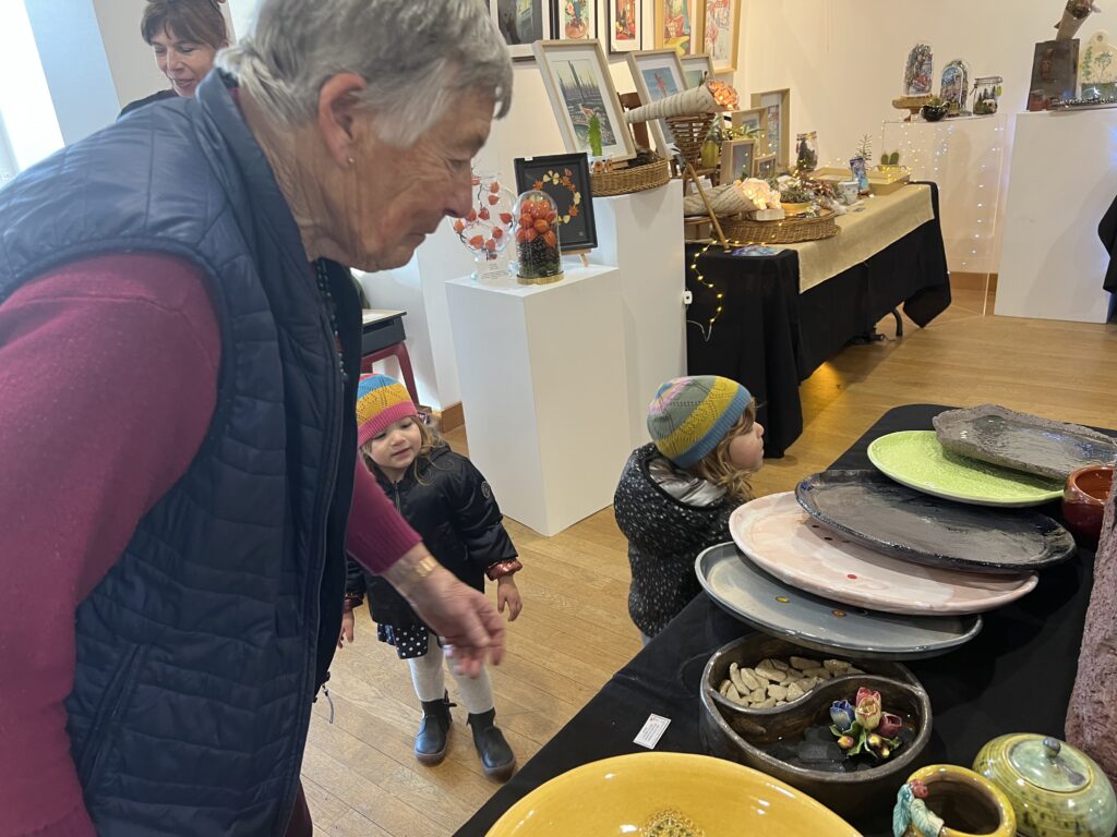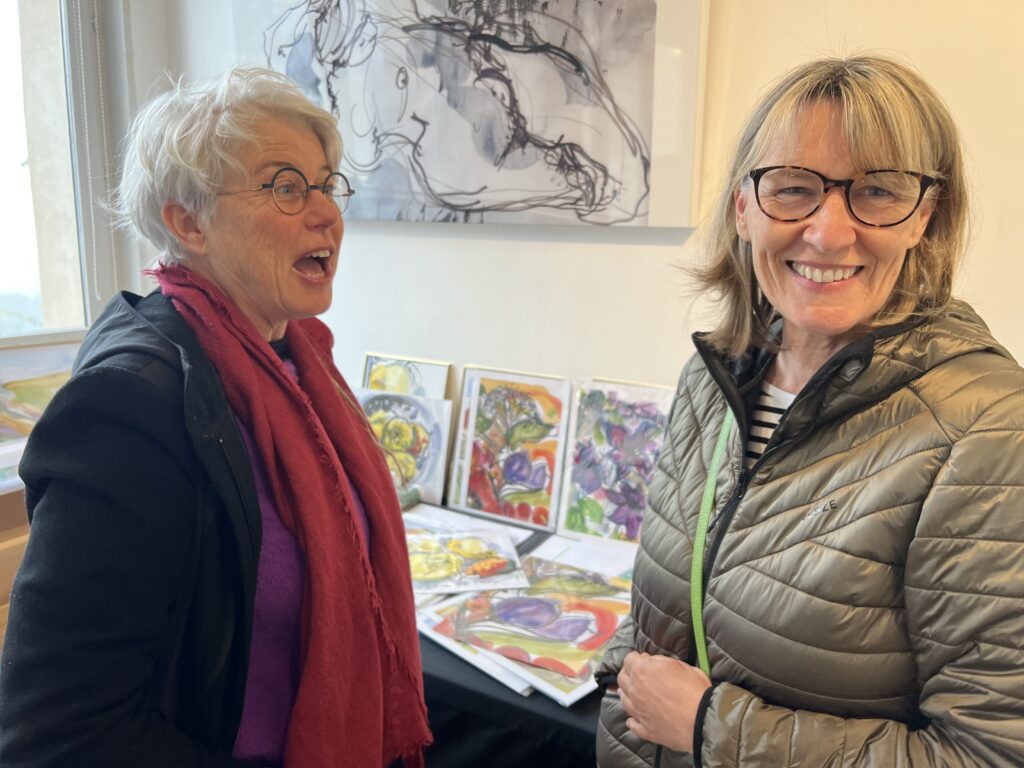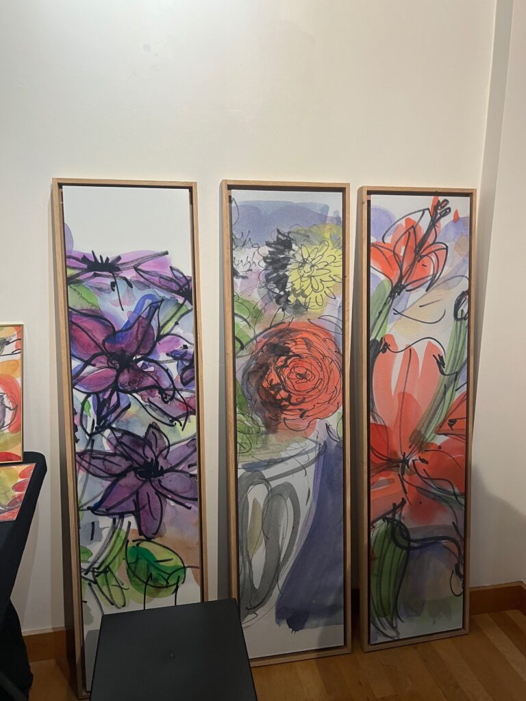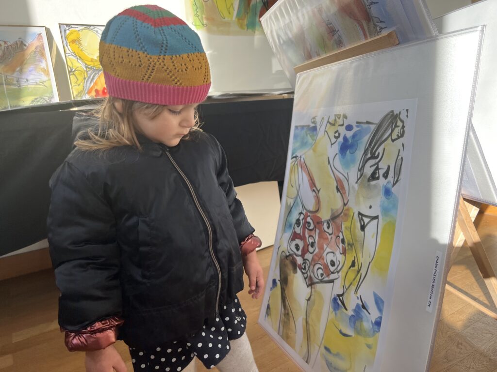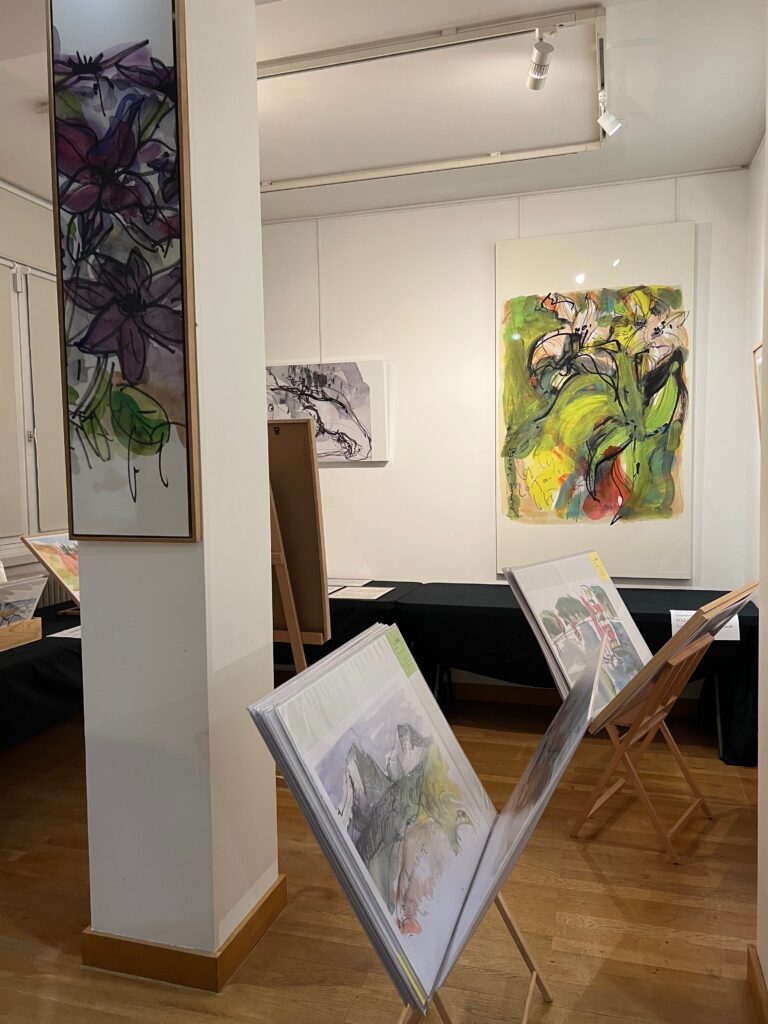 Pour la boutique 2025, j’ai projeté de réaliser de nouveaux grands formats panoramiques sur de la tôle d’aluminium, bandeaux horizontaux ou kakémonos. Les plus grands seront faits comme d’habitude sur commande et sur mesure, à partir de cette ensemble existant de variantes. Tourner autour de la pointe d’un compas ! Toutes les variantes me permettent d’approfondir à partir d’une sélection de l’année, et d’échapper à la routine. Je me suis permise de photographier la visiteuse ci-dessous, en train de choisir une présentation multi-format sur papier, sorte de panoramique en 3 morceaux mélangeant petits et grands posters. Dans ce cas précis, l’utilisation d’une cimaise à tableaux sans trou avec des câbles tendus lui permettra de changer ou switcher les images à loisirs. Les encadrements nécessaires pour du 30 x 40 cm et 50 x 70 cm sont standard. Elle trouvera pléthore d’encadrements à son goût dans les commerces de décoration et de beaux-arts. Je remercie au passage le Service Culturel de la Ville pour le grand et large plan de travail horizontal mis à disposition pendant l’exposition, sans lequel nous n’aurions pas pu manipuler, trier, fouiller, chiner dans tous ces dessins !