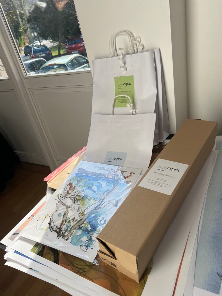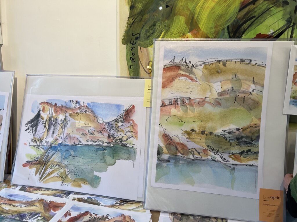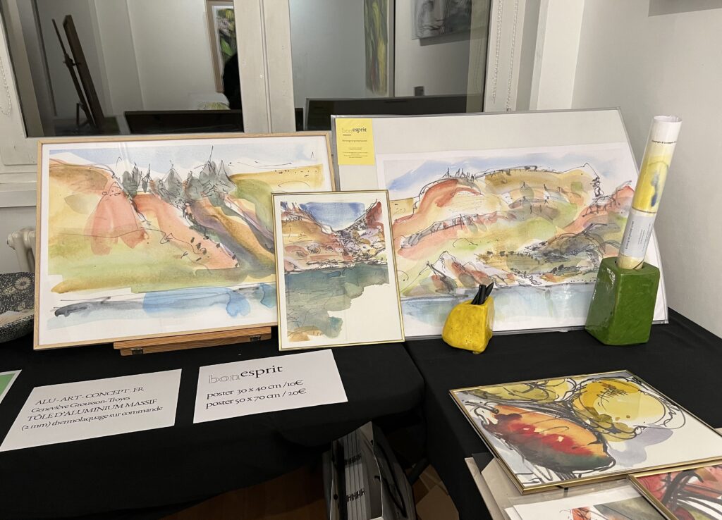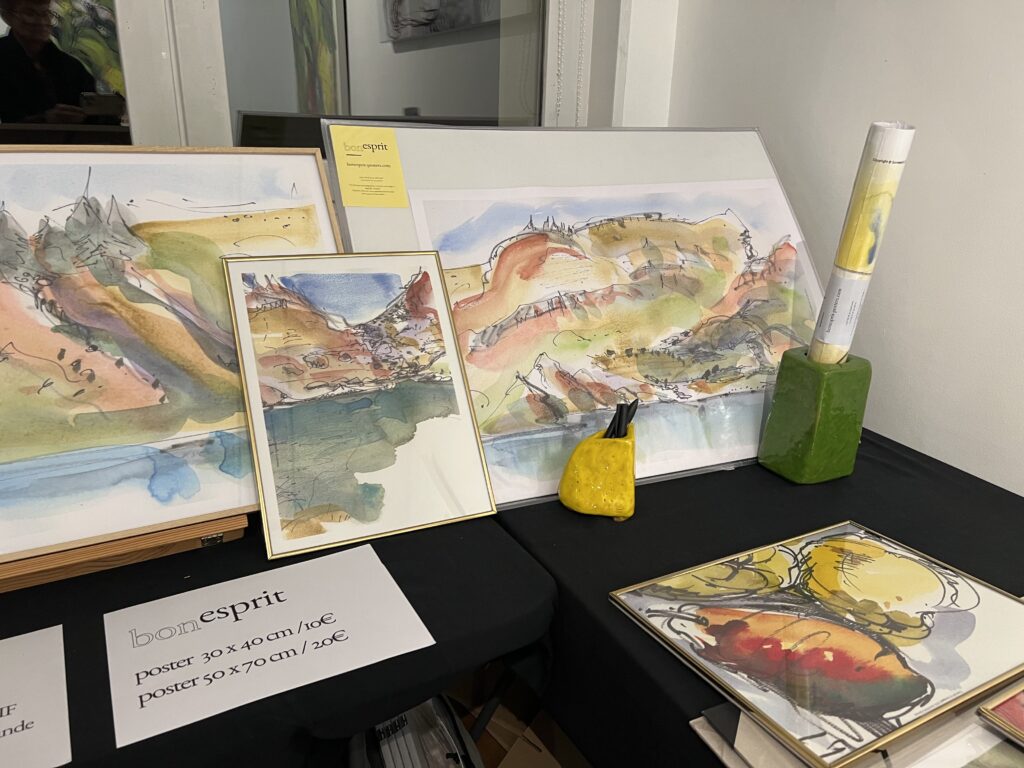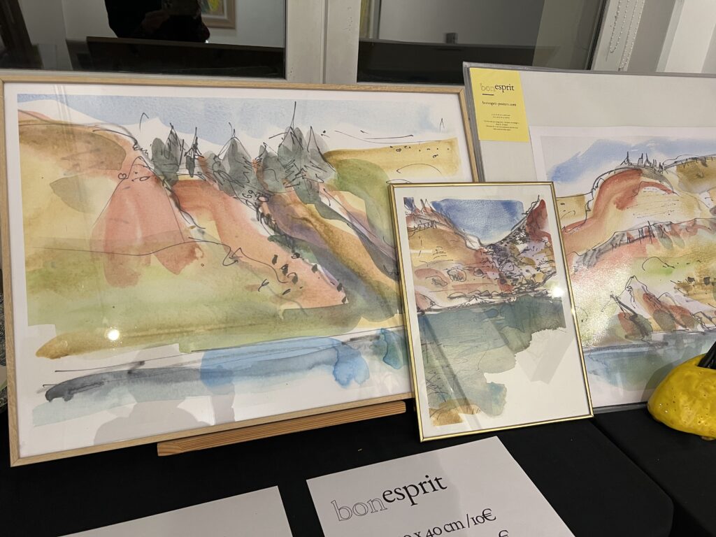 Décembre est là et la boutique au rez-de-chaussée du Belvédère est ouverte pendant que le marché de la place bat aussi son plein avec les créations locales et gourmandes. Nous sommes une poignée d’artistes-artisans à huit clos pour deux week-ends consécutifs bien remplis. J’expose et propose des impressions papiers sous l’étiquette « Bon esprit » petite marque personnelle que j’ai créé et que je partage avec Hélène B. exerçant à Biarritz, elle au sud-ouest, moi au sud-est.